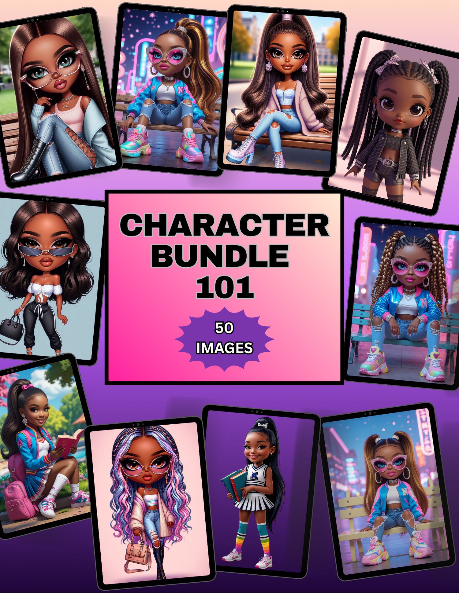 Enjoy this Beautiful Character Bundle. This bundle features 50 African American girl characters that has a flair of fashion. These characters are in high demand and is Chibi style inspired. These characters can be used and placed on many different physical crafting items. From wall art, stickers, scrap booking, to invitations, notebooks, journals, backpacks, handbags, mugs, tumblers, t-shirts, composition notebooks, these charming characters will add lots of fun and personality to all your projects. These characters can also be printed as sublimation and DTF. Enjoy and have fun creating with these images!